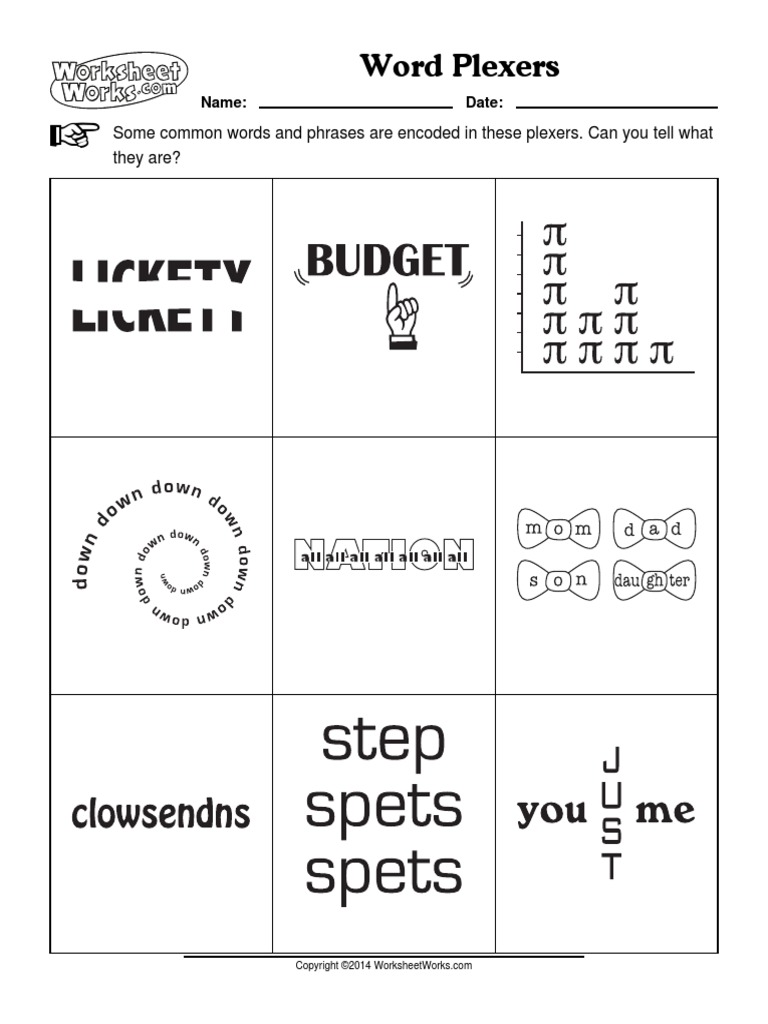Dingbats are a form of rebus puzzle also knowns as whatzits. One in a million please try and solve each rebus puzzle, writing your answer in the grey box provided. Most of our puzzles are intended for classroom as well as home use, so teachers and home schoolers are sure to find what they need. Santa can be transformed to spell satan. Each decode hint may suggest to: The word been might be depicted by a rebus showing an illustrated bumblebee next to a plus sign (+) and the letter n. The original set of letters may be a word itself, or simply a jumble. Some of the worksheets displayed are wackie wordies 57 wackie wordies 60 wacky wordies answer wacky wordies each of the puzzles below is a visual solutions work 1 molarity answer key chair t i s read. At puzzles to print you will find hundreds of printable puzzles that are absolutely free and ready to print, as well as pdf puzzle books that are easy to purchase and download. Open your mind and think outside the box! Feb 07, 2020 · blue gold banquet dinner printable rebus word puzzle preopener for the blue and gold cub scout banquet printable party game brain teaser see more. Rebus puzzles from puzzle to print free rebus puzzles printable offline games worksheets for 3rd grade students. Word scrambles can be used as educational tools or just to add a challenging activity to the day.